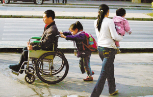 放學路上,6歲的萃萃(化名)推著爸爸回家。由于爸爸頸部以下完全癱瘓,媽媽忙于上班,剛上一年級的萃萃便負擔起了照顧爸爸乃至整個家庭的重任。晶報記者高雷/攝