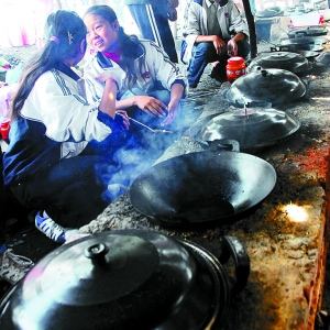 孩子們在泥灶上做午飯。程軍祥 攝