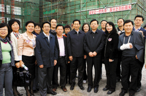 在由深圳商報慈善基金出資1500萬元援建的隴南市武都區城關中學工地,市領導劉玉浦、戴北方、李鋒與“讓愛繼續·隴南行”回訪團成員合影。本報記者朱 銳 攝