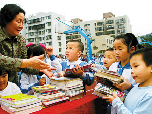 近日,田靜老師所在的林園小學舉行了一場特殊的捐書儀式。“災區的孩子一個班都沒有一本字典,我就買十幾本字典給他們。”一位抱著厚厚一摞新華字典的老師說。“小朋友們可能沒有連環畫看,我把我的連環畫送給他們。”一位三年級的學生說。五(一)班的鄭穎嵐拿著三本作文書和五本雜志放到了捐書桌上。