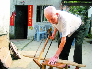 “歸僑老人”、101歲的鄭喜老人在做木工活