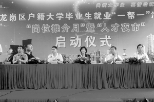 (本網(wǎng)訊)8月6日上午,龍崗區(qū)戶籍大學(xué)畢業(yè)生就業(yè)“一幫一”活動(dòng)崗位推介月暨“優(yōu)才2009”公益“人才夜市”啟動(dòng)儀式在龍崗區(qū)中心城清林中路勞動(dòng)就業(yè)服務(wù)大樓隆重舉行。從當(dāng)天開始,由區(qū)五套班子領(lǐng)導(dǎo)帶頭,全區(qū)部分機(jī)關(guān)干部每人幫扶一名大學(xué)生就業(yè)。