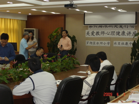 2009年4月1日下午放學(xué)后,“關(guān)愛大篷車”開進了水田小學(xué)的校園。深圳市精神衛(wèi)生中心楊洪副主任為學(xué)校的全體教師演講了一場以“壓力、困惑與調(diào)節(jié)”為主題的關(guān)愛教師心理健康的公益講座。整場講座氣氛活躍,引起了共鳴,使老師們學(xué)習(xí)到了化解壓力的諸多技巧,在歡聲笑語中緩解了教學(xué)壓力,提高了應(yīng)對生活和工作壓力的能力。講座后,還首次對深圳市的小學(xué)教師進行了心理健康知識知曉率的調(diào)查。