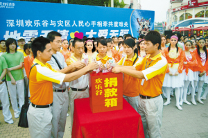 這是一串堅(jiān)實(shí)的愛(ài)的足跡——2005年1月,深圳歡樂(lè)谷組織員工為海嘯災(zāi)區(qū)獻(xiàn)愛(ài)心,共計(jì)捐款1萬(wàn)多元,衣物1000多件;同年4月,歡樂(lè)谷組織員工為貴州貧困地區(qū)捐款1.5萬(wàn)多元,衣物900多件;2007年,深圳歡樂(lè)谷攜手北京歡樂(lè)谷,啟動(dòng)以“十分·愛(ài)”為主題的公益募捐活動(dòng),從7月1日至10月8日的100天內(nèi),深圳歡樂(lè)谷每售出一張門(mén)票都會(huì)捐出一角錢(qián),善款全部用于扶持黔東南貧困地區(qū)的教育事業(yè)。2008年汶川大地震后,歡樂(lè)谷向?yàn)?zāi)區(qū)捐款200萬(wàn),員工們自發(fā)捐款8萬(wàn)元;2008年7月16日下午,歡樂(lè)谷接待了來(lái)自北川中學(xué)的百名學(xué)生。