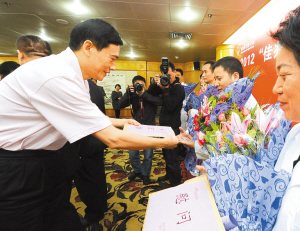 昨日,2012佳兆業白衣天使關愛工程在深圳報業集團舉行。圖為啟動儀式上10位醫護人員代表接過了關愛辦等領導送上的慰問金和鮮花?! ”緳跀z影深圳商報記者 陳發清