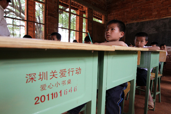 在羅江鄉小滿村學校,換上新桌椅的學生正在上課。