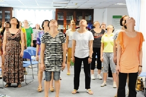????昨天上午,來自我市各醫院的護士和醫生正在香港大學行為健康中心導師的指導下做放松身心的游戲。
