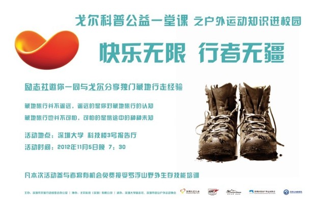 ????深圳新聞網(wǎng)訊 2012年11月5日晚七點半,主題為“快樂無限,行者無疆”的“戈爾科普公益一堂課”將攜手深大勵志社走進(jìn)深圳大學(xué),為熱衷于戶外運動的高校學(xué)子奉獻(xiàn)一堂實用又有趣的戶外運動知識講座。來自深圳市登山戶外運動協(xié)會的資深講師——老虎將在講座上全方位分享他的藏地行走經(jīng)驗。