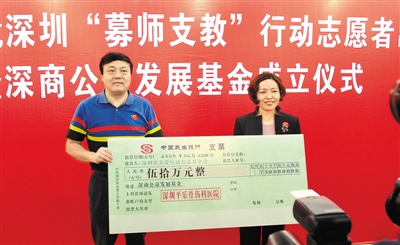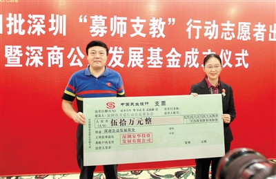 昨天,第十四批深圳“募師支教”行動志愿者出發暨深商公益發展基金成立儀式在深圳報業集團舉行。深圳商報總編輯姜東南代表深商公益發展基金接受深圳平樂骨傷科醫院50萬元人民幣捐款。