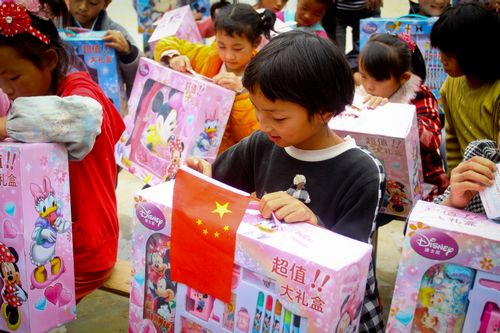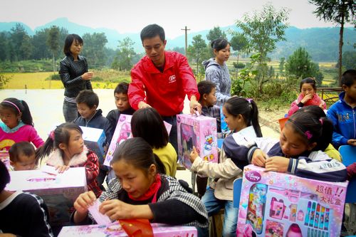 志愿者為孩子們分發大禮包