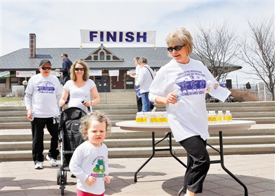 ??? 北京時間4月8日,美國印第安納州拉法葉當?shù)鼐用褡栽笀竺麉⒓踊丶抑飞鐓^(qū)公益活動。本次活動募集的善款將用于為無家可歸的人籌建房屋、改善生活。圖為大人孩子一同參與社區(qū)公益活動,走到五千米終點。中新