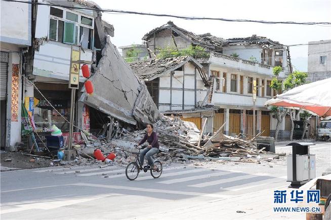 4月20日,一名居民從蘆山縣城內垮塌的房屋前經過。當日,四川雅安蘆山縣發生7.0級地震。其中蘆山縣的龍門鄉、寶盛鄉、太平鎮三地受災最為嚴重。新華社記者 金小明 攝