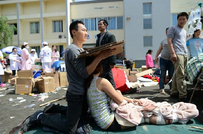 最有愛丈夫,跪地給受傷妻子遮陽 4月20日,在蘆山縣人民醫院,傷者在接受救治。一男子跪地給受傷妻子遮陽。