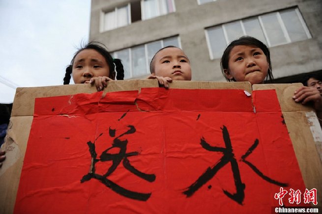 送水的兒童,救援生命線上的感動 4月20日,在去往四川寶興縣地震災區路途中,幾名小學生自發在路邊為過往的救援人員送水。