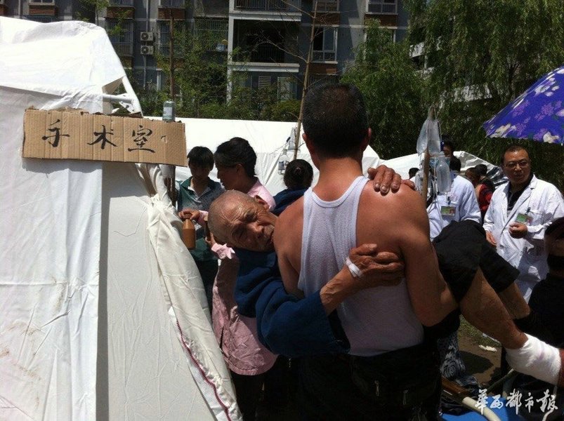 最孝順兒子說:不累!四川蘆山縣醫院,大量傷員送來,醫院也受損嚴重,一平壩搭建成為臨時帳篷醫院。手術室外,一位蘆山男子抱著父親等待手術,沒座位,該男子足足抱了父親一小時,他說,不累!