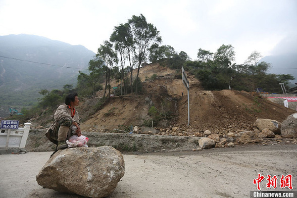 雅安7級地震造成寶興縣城的烈士陵園出現塌方,一名災民正蹲在石頭上等待救援。許云峰 攝