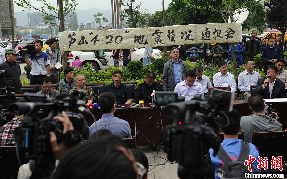 4月21日下午,四川雅安市在蘆山震災區召開抗震救災通報會,通報會上集體向“4.20”地震遇難同胞默哀,期間還兩次發生余震。截至21日地震已導致當地168人遇難,24人失蹤,10871人受傷。已發生余震1606次,最大余震5.4級。圖為雅安市政府副市長廖磊通報震情。中新社發劉忠俊 攝