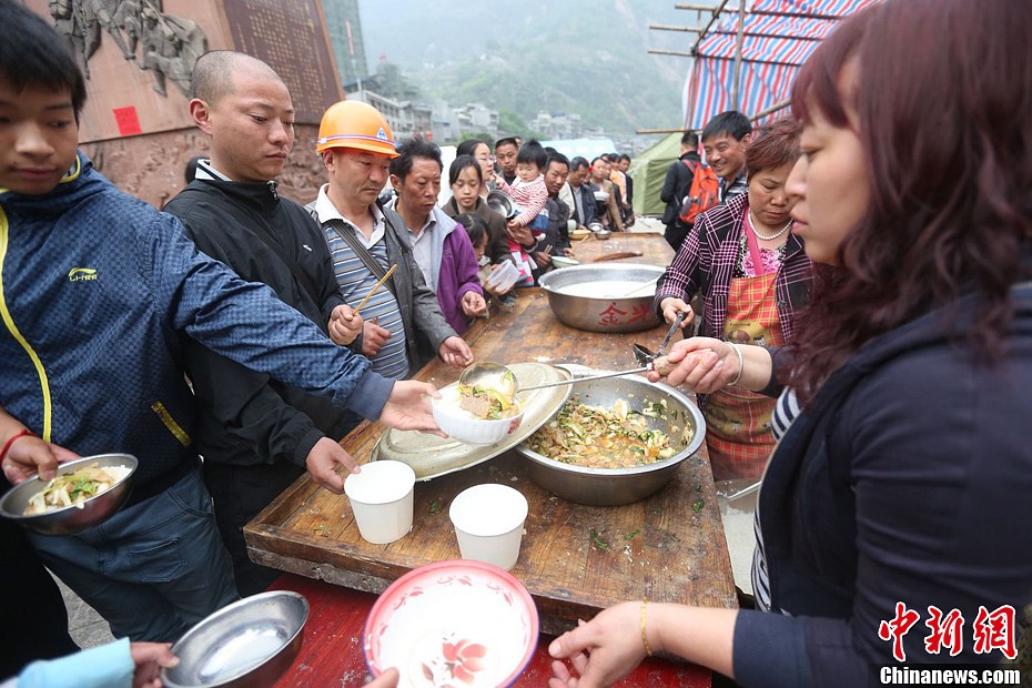 4月21日,四川省雅安市寶興縣靈關鎮靈關中學災民安置,志愿者為災民送水。中新社發 廖攀 攝