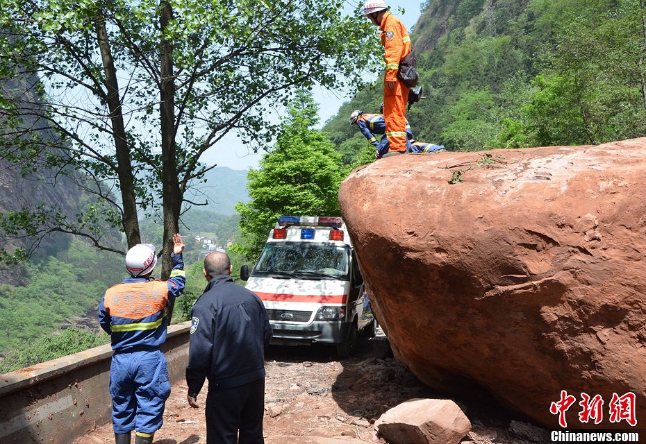 在4.20雅安地震發生后,震區道路堵塞始終是救援死結。圖為山上震下的巨石擋路,救援人員正在小心通過。中新社發 肖遠攝