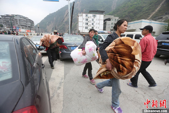 21日傍晚,3名災民們抱著被褥前往位于寶興縣中學的安置點。這個安置點為數千名災民提供帳篷、食品、飲水和電視娛樂等各類服務。許云峰攝
