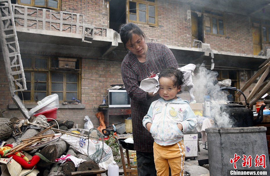 4月21日,四川雅安地震重災區蘆山龍門鄉隆興村,在得到足夠水后,一位小朋友在震后得以第一次洗頭。中新社發 張浩 攝
