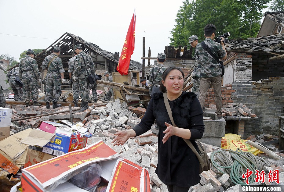 4月21日,四川雅安地震重災區蘆山龍門鄉,一名百貨店的老板正在講述她震后的經歷,而她身后的官兵們正在幫她搜出散落的百貨。中新社發張浩 攝