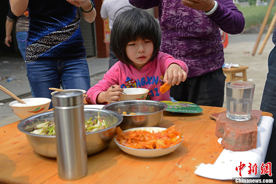 4月21日下午2點(diǎn),蘆山縣龍門(mén)鄉(xiāng)75歲的村民傅玉潤(rùn)一家,地震以來(lái)第一次吃上了大米飯。從4月20日地震發(fā)生以來(lái),傅玉潤(rùn)家都是吃的方便面和餅干,今天利用自家地里的菜和受損房間里的米做了一餐飯菜。中新社發(fā)張?jiān)?攝