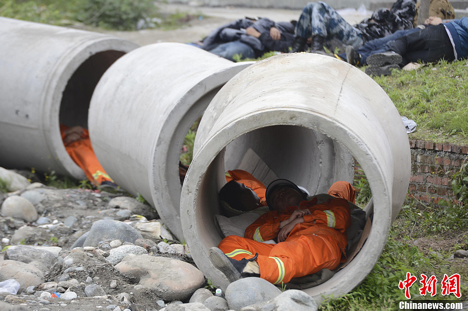 4月21日,四川省雅安市寶興縣靈關(guān)鎮(zhèn),疲憊的救援隊員。中新社發(fā)廖攀 攝
