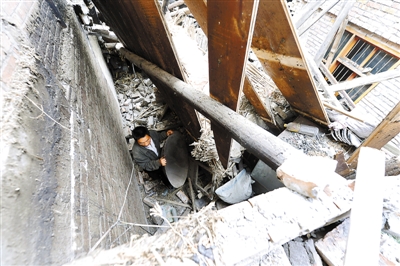 昨天上午,蘆山縣古城村古城坪村民小組村民駱良勇從倒塌的廢墟里把煮飯的大鍋扒拉了出來。