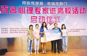 ????深圳晚報(bào)訊 (記者 向薇) 昨日下午,深圳大學(xué)城圖書館報(bào)告廳座無(wú)虛席,“百名心理專家進(jìn)高校”啟動(dòng)儀式在此隆重舉行。來(lái)自深圳市關(guān)愛(ài)辦、深圳市愛(ài)心與共幸福促進(jìn)中心、深圳高教辦、深圳大學(xué)城、深圳市精神衛(wèi)生中心等多家機(jī)構(gòu)代表及心理專家、大學(xué)生代表等200多人,齊聚一堂,為建造更和平美好的高校校園,共同尋找幸福秘方。