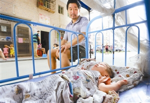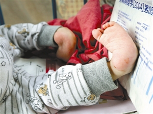 昨日下午,在凌先生的指引下,記者來到坂田水斗坑西村七巷12樓下見到了爺孫倆。爺爺正趴在一張破舊不堪的嬰兒床上,寸步不離守護著孫子,一名大約3歲的男童靜靜地躺在嬰兒床內熟睡著。男童雙腳有缺陷,其腳心朝上腳背朝下,并且兩腳均向內側橫長。