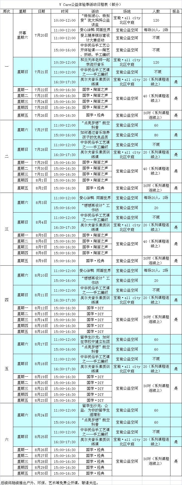 ????20日上午,V-care寶能公益空間正式揭幕,V-care暑期公益體驗季系列活動率先展開。7月20日至8月30日,包括愛心涂鴨、航天科普、手工拼豆、音樂、陶笛、DIY、舊物改造、留學生沙龍、戶外、環保、藝術等近百場活動將陸續向市民免費開放。