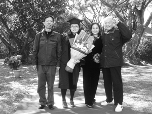 女兒研究生畢業時,郭寧康一家三代在香港中文大學合影。