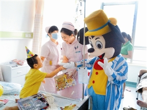 護士長帶著“米老鼠”給住院的孩子送禮物。
