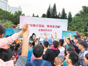 【深圳商報訊】(記者 文燦 文/圖)為讓市民進一步加深對垃圾分類知識了解,積極參與到垃圾分類工作中來,并正確掌握垃圾分類的方法,上周六,市城管局垃圾分類中心和深圳商報在蓮花山公園廣場開展了“垃圾不落地,深圳更美麗”有獎問答活動,吸引了上萬市民參加。