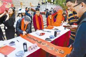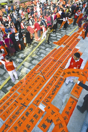 ▲書法家現場揮毫潑墨,春聯鋪天蓋地。