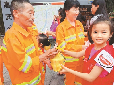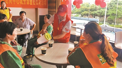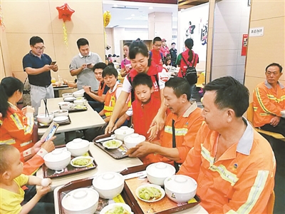 羅湖分部的小志愿者為環衛工人送上營養暖餐。