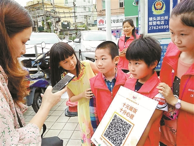 寶安分部小志愿者向市民推薦關愛環衛工人的項目。