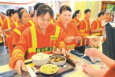 ▲環衛工人憑餐券到真功夫門店領取愛心待餐。