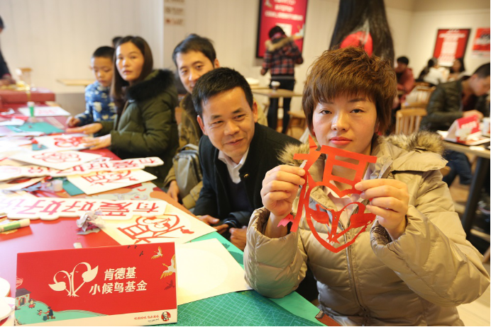 “如果在春節(jié)期間,可以通過(guò)中國(guó)傳統(tǒng)手工藝術(shù)與孩子一同動(dòng)手打造春節(jié)氛圍,是一件一舉多得的事兒。”為了能夠讓春運(yùn)期間在肯德基餐廳等候的家長(zhǎng)們獲得一個(gè)可以打開(kāi)親子溝通之門的“鑰匙”,肯德基小候鳥(niǎo)基金特別邀請(qǐng)了中國(guó)新派剪紙藝術(shù)家郭夢(mèng),在餐廳內(nèi)現(xiàn)場(chǎng)指導(dǎo)小候鳥(niǎo)家長(zhǎng)們,如何將親子溝通融入到一起動(dòng)手的傳統(tǒng)手工藝術(shù)制作中,用簡(jiǎn)單的親子互動(dòng)達(dá)到意想不到的效果。