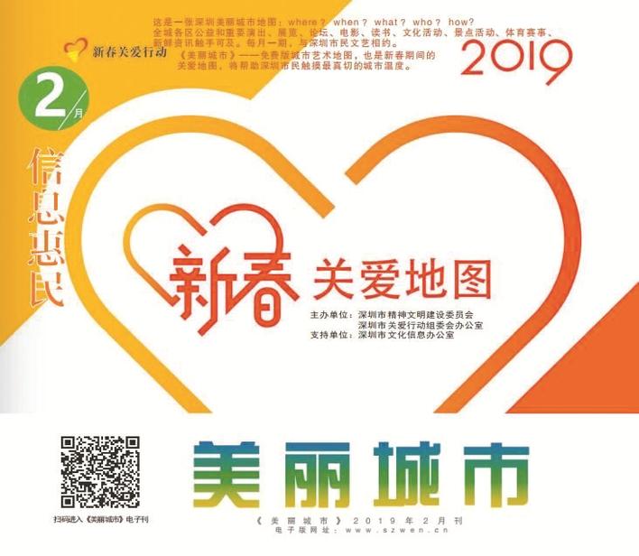 1月28日,由深圳市關(guān)愛辦聯(lián)合市文體旅游局推出的“2019新春關(guān)愛地圖”正式推出。該項目作為2019新春關(guān)愛行動文化福利板塊的重點項目,已連續(xù)推出兩年。今年,新春關(guān)愛地圖再次帶著全市百余項適合市民參與的活動資訊而來,不僅有新春關(guān)愛行動七大板塊“感恩慰問”“溫暖回家”“在深過年”“文化福利”“網(wǎng)絡(luò)公益”“精準扶貧”“志愿服務(wù)”的重點關(guān)愛活動,還有大量文化、旅游、電影、講座、展覽等資訊。