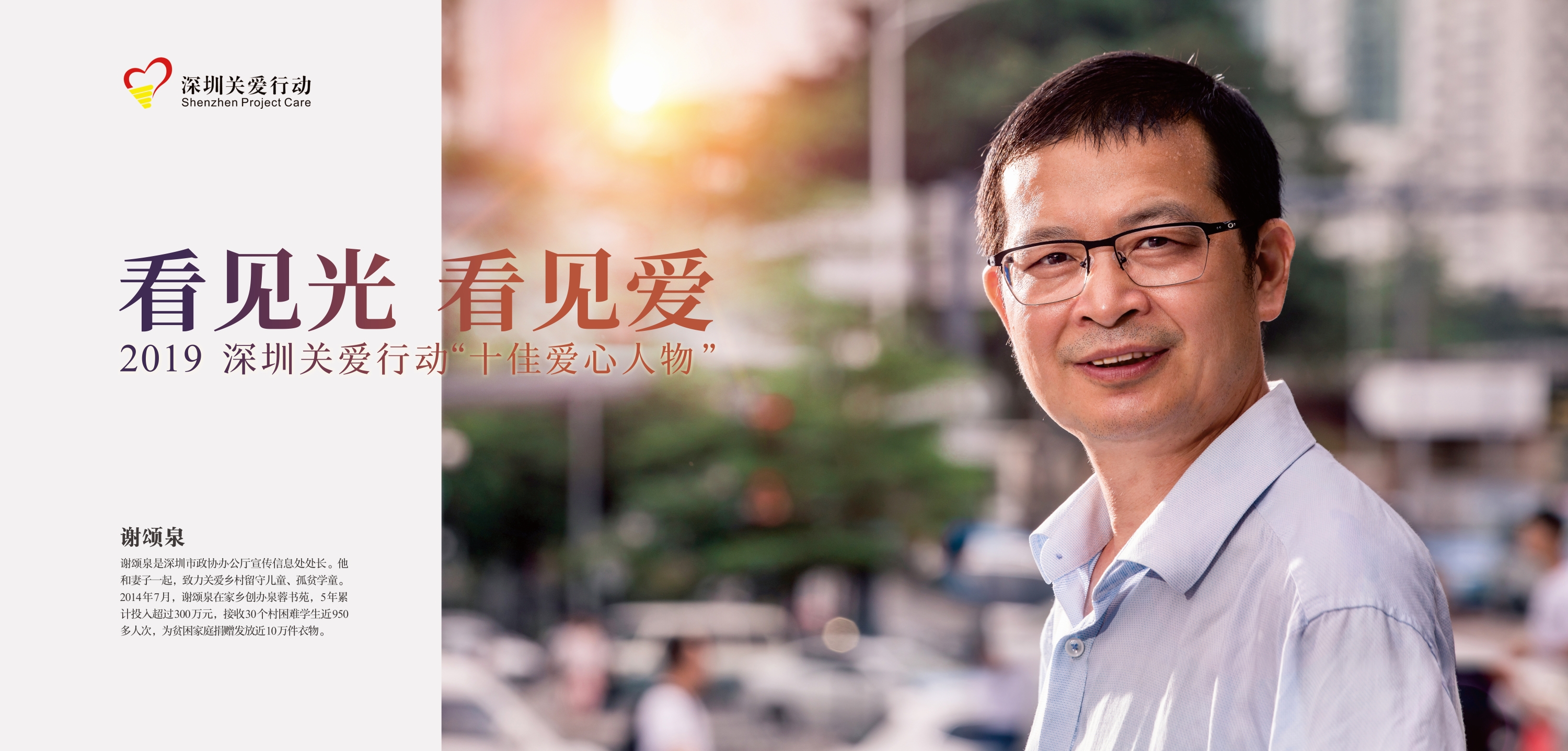 男,深圳市政協(xié)辦公廳宣傳信息處處長。謝頌泉、扶蓉夫婦,心系家鄉(xiāng),致力關(guān)注關(guān)愛鄉(xiāng)村留守兒童、“缺三親”(缺親人、缺親情、缺親伴)孤單貧困學(xué)童的健康成長。他把為鄉(xiāng)村青少年健康成長和弘揚(yáng)鄉(xiāng)村文化教育、村民精神文明服務(wù)當(dāng)作使命及榮耀,真情關(guān)懷、真金投入,動(dòng)員和率領(lǐng)全家為湖南衡山鄉(xiāng)村精準(zhǔn)教育幫扶,在勵(lì)志扶智助學(xué)和助殘、救孤、濟(jì)困等方面做了諸多實(shí)事。2014年7月,創(chuàng)辦泉蓉書苑, 5年累計(jì)投入基礎(chǔ)設(shè)施建設(shè)和日常運(yùn)作費(fèi)用累計(jì)超過300多萬元;接收30個(gè)村以留守兒童和孤單貧困學(xué)童為主體的中小學(xué)生近 950 多人次;為貧困家庭捐贈(zèng)發(fā)放近 10 萬衣物;2017年11月,動(dòng)員深湘兩地愛心人士捐款籌資18萬多元,幫助8歲卻因脊柱側(cè)彎而只有2歲身高的女學(xué)童成功進(jìn)行手術(shù)。