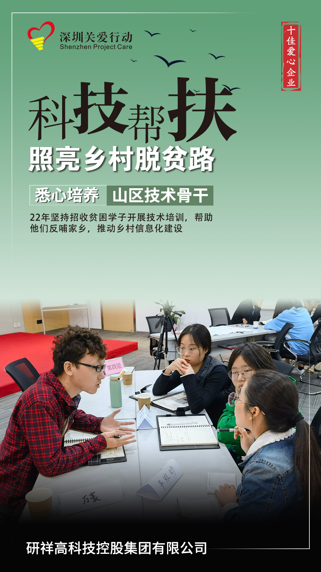 研祥集團(tuán)堅(jiān)持參加社會(huì)公益事業(yè)和扶貧工作,從1999年至今,每年招收數(shù)十名來(lái)自廣東東源縣、廣西梧州、河南蘭考縣等地區(qū)因貧困未能考取大學(xué)的青年學(xué)生,到集團(tuán)接受設(shè)計(jì)技術(shù)專業(yè)的公益培訓(xùn),授之以漁,使他們掌握相關(guān)技能之后,回鄉(xiāng)成為當(dāng)?shù)丶夹g(shù)骨干并帶動(dòng)當(dāng)?shù)匦畔⒒ㄔO(shè)發(fā)展。