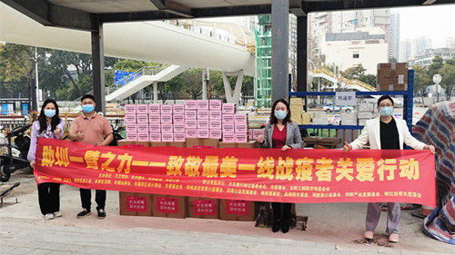 深圳市關(guān)愛行動公益基金會迅速行動,聯(lián)合公益伙伴、愛心企業(yè)迅速籌集關(guān)愛物資。本來生活網(wǎng)捐贈一批食品、飲料和飲用水。深圳市潮汕商會聯(lián)合廣州泓景堂醫(yī)藥有限公司捐贈了800箱金銀花保健涼茶。關(guān)愛基金會·粉紅絲帶關(guān)愛基金捐贈了2000瓶抑菌洗手液,關(guān)愛基金會·創(chuàng)新產(chǎn)業(yè)發(fā)展基金捐贈了食品和飲用水。這批關(guān)愛物資在深圳市職工解困濟難基金會和福田區(qū)總工會的支持下,迅速送達福田區(qū)福保街道,由街道工會負責安排志愿者為一線抗疫人員送去生活物資和健康關(guān)愛。