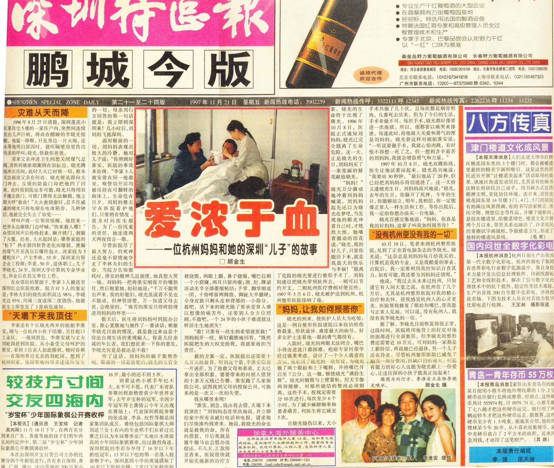 李曉光至今還留著一張報紙,他珍惜地把它過膠塑封,保存在身邊。那是《深圳特區(qū)報》1997年11月21日刊登的一篇報道《愛濃于血——一位杭州媽媽和她的深圳“兒子”的故事》,報道的正是他當(dāng)年在杭州醫(yī)院做整形手術(shù)時的經(jīng)歷。