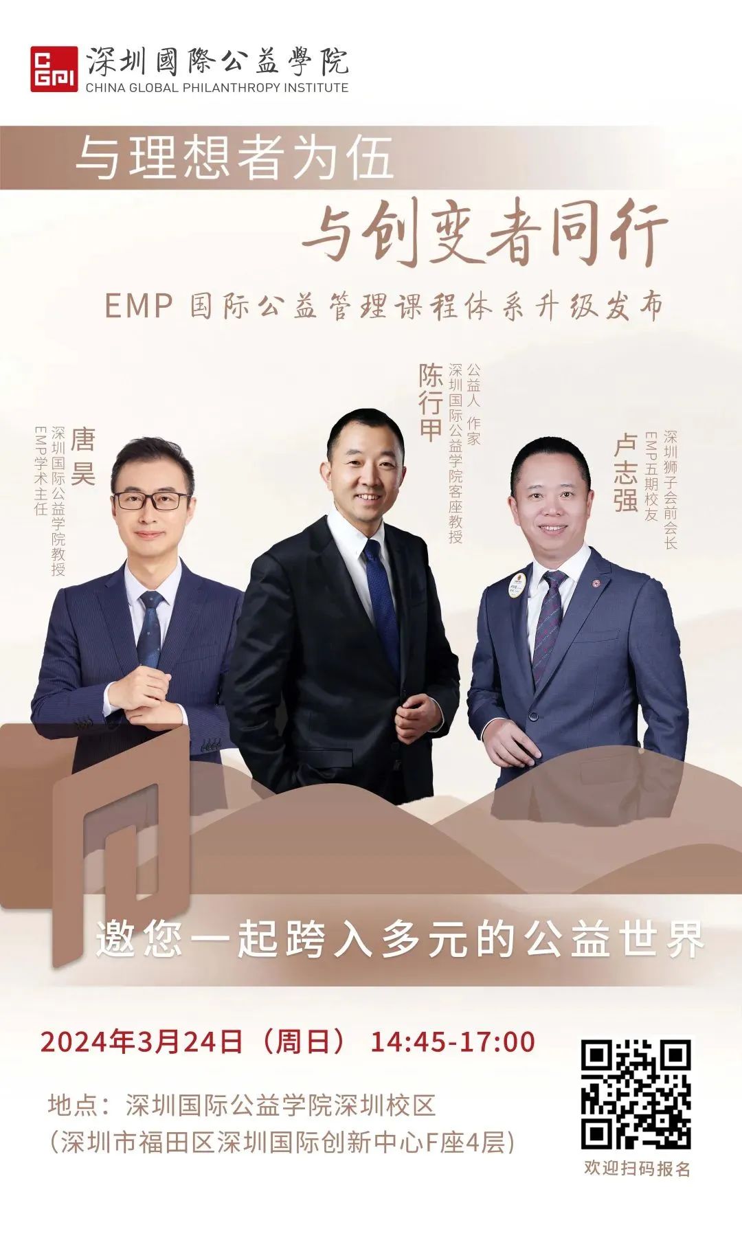 活動簡介:3月24日,在深圳國際公益學(xué)院的三尺講臺上,陳行甲將分享《我的公益之路》,并與深圳國際公益學(xué)院EMP五期校友、深圳獅子會前會長盧志強(qiáng),共同探討“多元的公益世界”。同時深圳國際公益學(xué)院教授唐昊將分享EMP國際公益管理課程的最新變化,這也是順應(yīng)時代發(fā)展對公益專業(yè)化進(jìn)程的一次思考與變革。