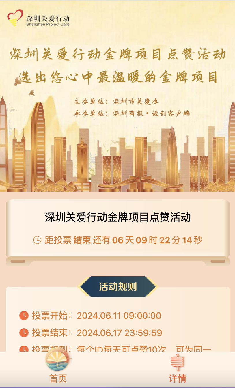 為推廣這些充滿溫情的關愛項目,進一步激發社會各界參與關愛行動的熱情,共同推動深圳關愛行動向更高水平發展,深圳市關愛辦于今日(2024年6月11日)正式啟動了“深圳關愛行動金牌項目”點贊活動。