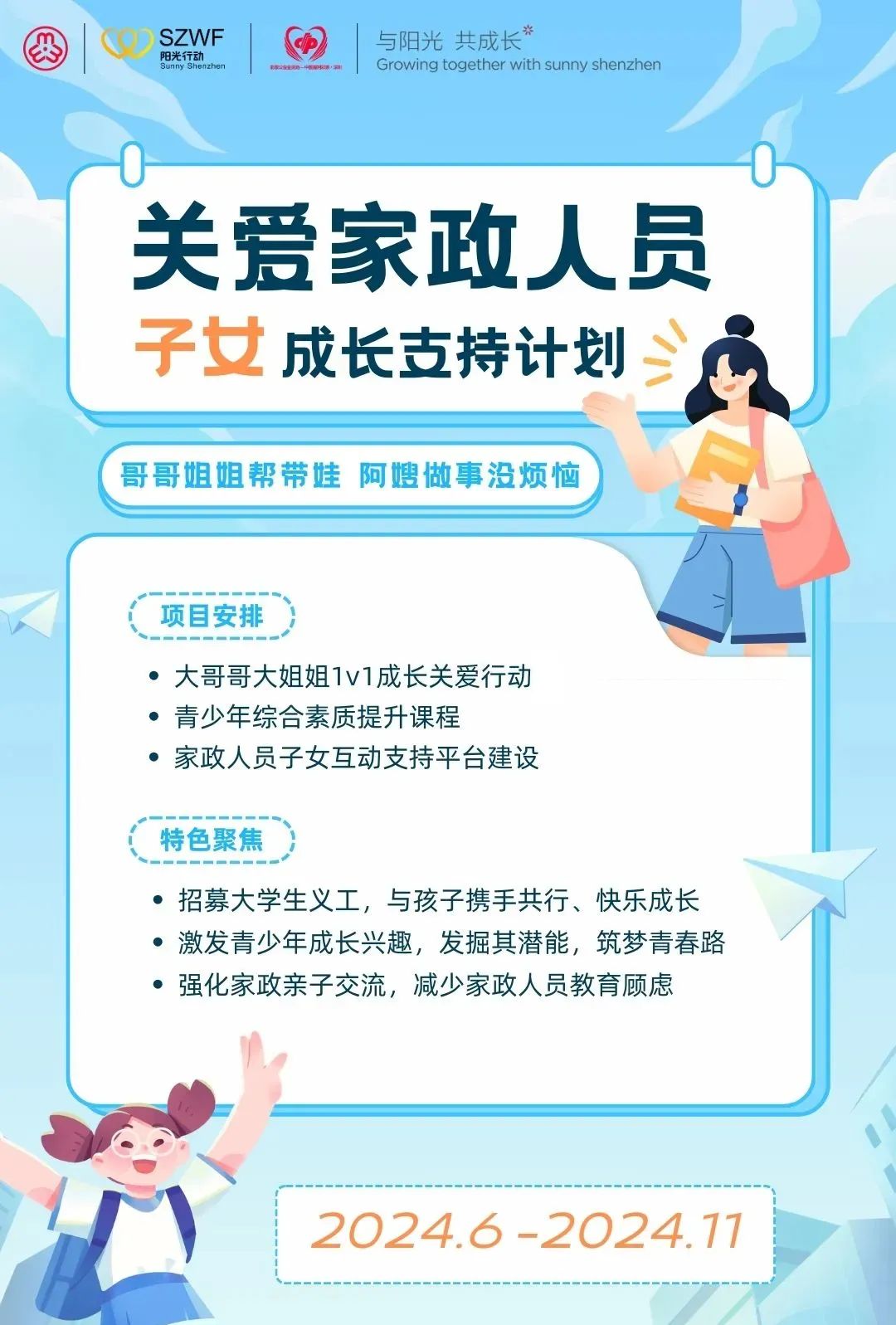活動(dòng)簡(jiǎn)介:隨著社會(huì)的發(fā)展和人們生活節(jié)奏的加快,家政服務(wù)已經(jīng)成為越來(lái)越多家庭的需求,家政人員為我們的生活提供便利的同時(shí)他們的子女卻因?yàn)楦改傅墓ぷ鞣泵Χ狈ε惆楹完P(guān)注。為此,深圳市婦聯(lián)發(fā)起關(guān)愛(ài)家政人員子女成長(zhǎng)支持計(jì)劃,通過(guò)招募大學(xué)生志愿者為全市100個(gè)家政人員子女提供關(guān)愛(ài)成長(zhǎng)服務(wù)。