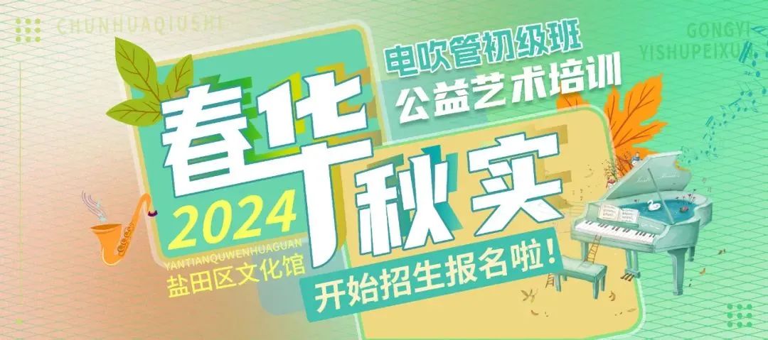 活動(dòng)簡(jiǎn)介:深圳市鹽田區(qū)文化館已成功開(kāi)辦多期電吹管零基礎(chǔ)公益培訓(xùn)課,為熱愛(ài)電吹管的人群開(kāi)啟了一扇通往音樂(lè)藝術(shù)殿堂的大門(mén)。為了滿足更多音樂(lè)愛(ài)好者的學(xué)習(xí)熱情,鹽田區(qū)文化館將增設(shè)“春華秋實(shí)”電吹管初級(jí)班公益培訓(xùn)課。
