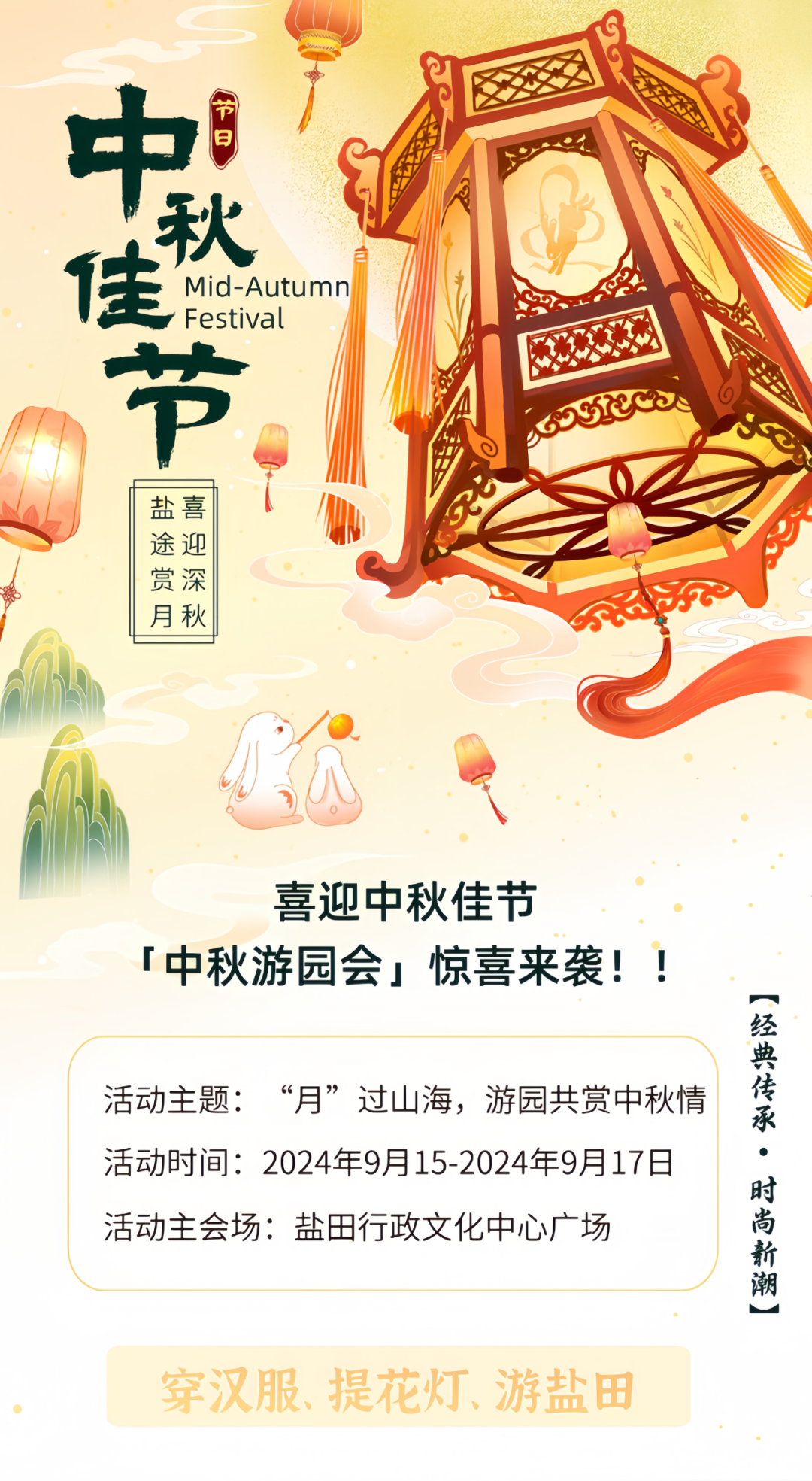 活動簡介:中秋活動精彩紛呈,包括漢服巡游、花燈游園、風箏嘉年華、非遺花燈展演等。9月15日至17日,漢服愛好者將身著華服,手提特色花燈巡游鹽田。同時,還有漢舞快閃、漆扇制作、投壺游戲等互動體驗。此外,還有越劇《孟麗君》演出、弦樂音樂會、中秋彩燈嘉年華等文化活動?;顒痈采w鹽田多個熱門地點,如中英街、小梅沙等,誠邀市民共赴這場古風盛宴。